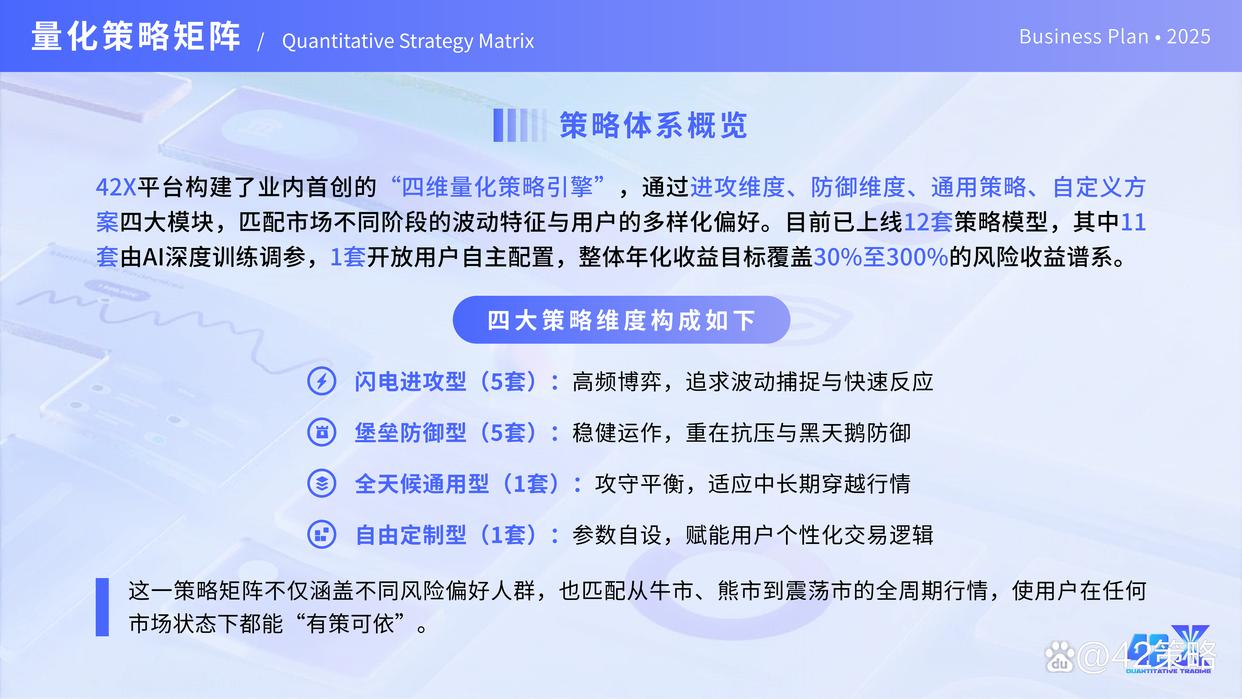 针对聪明资金 “懂市场、善布局、求稳健” 的特性,42X 构建了四维策略矩阵,覆盖不同市场周期与投资偏好。当市场高波动时,闪电进攻型策略借助毫秒级感知引擎与高频执行逻辑,捕捉波段套利机会;遭遇熊市或黑天鹅事件,堡垒防御型策略通过风险识别与仓位收缩机制,守护资产安全;通用平衡策略则适配长期配置需求,以双边引擎协同与风险自适应算法,实现资产稳健复利增长;自由定制策略更下沉服务,支持投资者零代码组合参数,打造个性化增值方案。