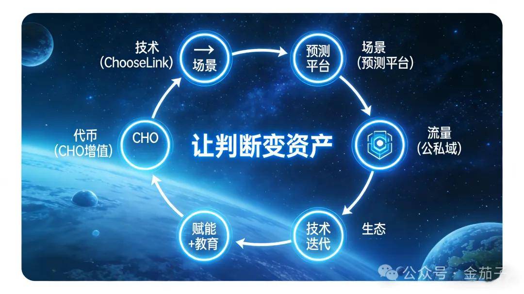 平台的落地,将实现ChooseMe生态的价值闭环:技术(ChooseLink)支撑场景(预测平台),场景吸引流量(公私域用户),流量驱动生态(赋能项目方、培育人才),生态反哺技术(迭代优化预言机能力),最终通过母币CHO的价值增长,实现用户、项目方、生态的多方共赢。